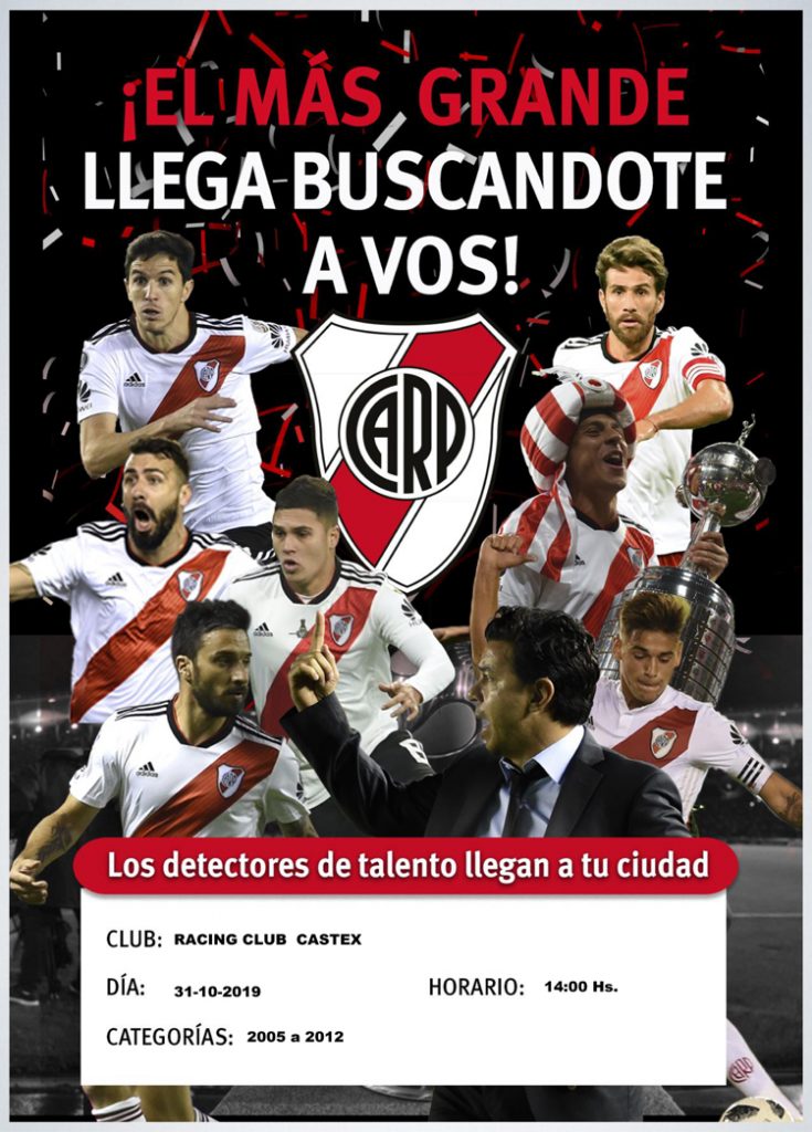 Así lo anunció la oficial del albo: Por segunda vez en el año, captadores del Club Atlético River Plate llegarán a Eduardo Castex. Será el próximo jueves 31 de octubre en el estadio “Héctor Nervi”, a partir de las 14 horas.