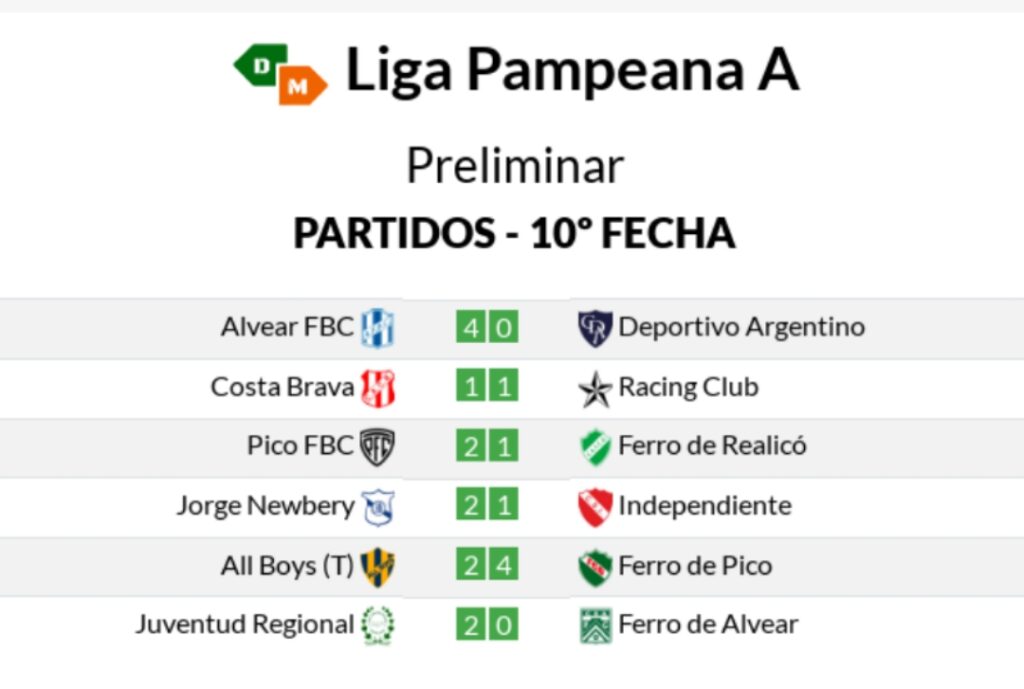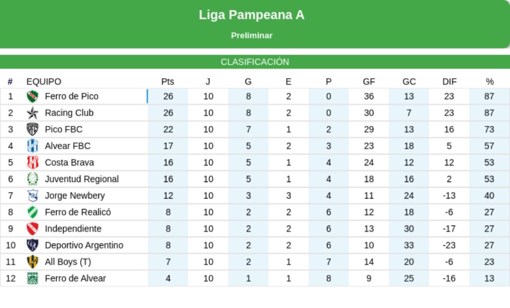 El día sábado Ferro de Pico derrotó a All Boys de Trenel y en la tarde de éste domingo Racing igualó de visitante ante Costa Brava y así en la última fecha llegan ambos con 26 unidades.