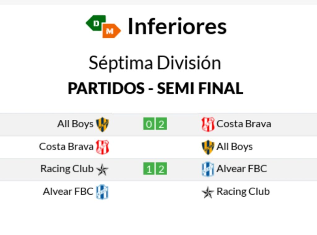 Se jugó el partido de ida de la Semifinal del Torneo de Inferiores, en Septima Racing recibió a Alvear FBC y fue triunfo azul por 2 a 1: Benjamin Iglesias y David Morales habían adelantado al alvearense por 2 goles, descontó sobre el final para el albo Tiziano Corral.